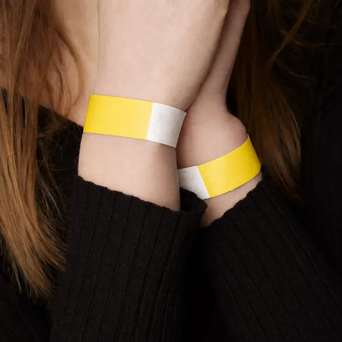 Tyvek ist das Geheimnis hinter Papierarmbändern! Papierarmbänder bestehen – entgegen dem Namen – nicht aus Papier, auch wenn sich das Material wie weiches Papier anfühlt und ihm zum Verwechseln ähnlich sieht. Die Armbänder werden vielmehr aus Tyvek hergestellt. Tyvek ist ein äußerst strapazierfähiges Material, das unter anderem zur Herstellung von Schutzanzügen verwendet wird. Das Material ist nahezu unmöglich zu zerreißen, lässt sich jedoch sehr leicht mit einer Schere oder einem Messer durchtrennen, wenn Gäste das Armband wieder abnehmen möchten. Papierarmbänder sind problemlos wasserfest – egal ob Bier verschüttet wird, Hände gewaschen werden oder Gäste baden gehen. Tyvekarmbänder werden zum Beispiel auch in Resorts eingesetzt, um den Überblick darüber zu behalten, welche Gäste All-inclusive, Halbpension usw. haben.