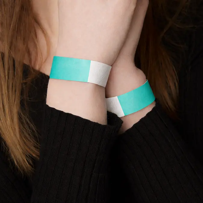 Tyvek ist das Geheimnis hinter Papierarmbändern! Papierarmbänder bestehen – entgegen dem Namen – nicht aus Papier, auch wenn sich das Material wie weiches Papier anfühlt und ihm zum Verwechseln ähnlich sieht. Die Armbänder werden vielmehr aus Tyvek hergestellt. Tyvek ist ein äußerst strapazierfähiges Material, das unter anderem zur Herstellung von Schutzanzügen verwendet wird. Das Material ist nahezu unmöglich zu zerreißen, lässt sich jedoch sehr leicht mit einer Schere oder einem Messer durchtrennen, wenn Gäste das Armband wieder abnehmen möchten. Papierarmbänder sind problemlos wasserfest – egal ob Bier verschüttet wird, Hände gewaschen werden oder Gäste baden gehen. Tyvekarmbänder werden zum Beispiel auch in Resorts eingesetzt, um den Überblick darüber zu behalten, welche Gäste All-inclusive, Halbpension usw. haben.
